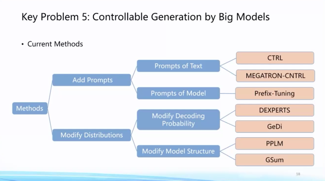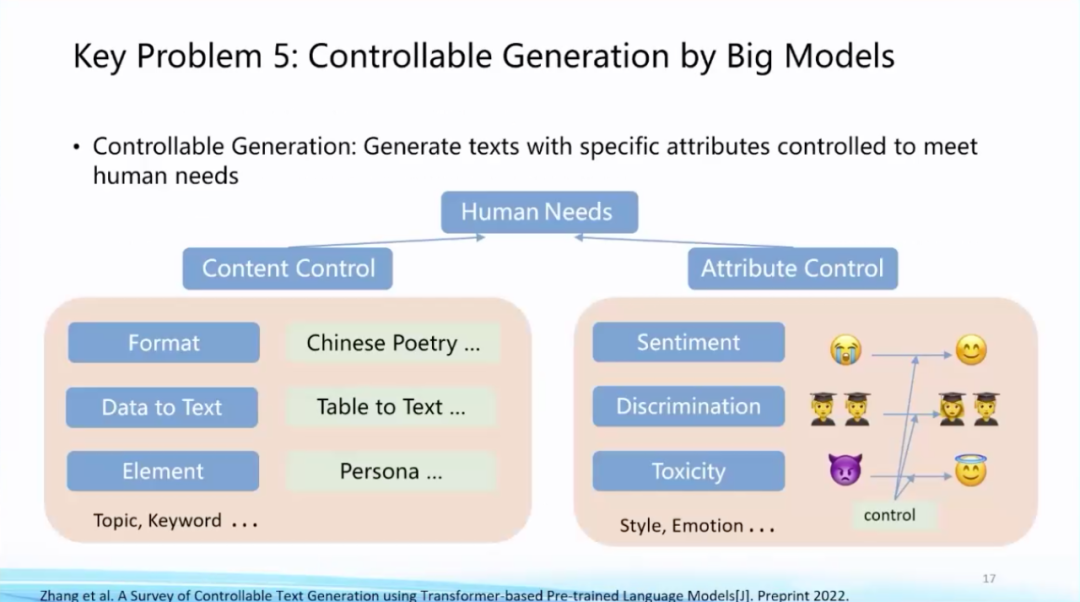 第五个问题,大模型的可控生成。目前大模型已经可以生成一些新的文本或图像,但如何精确地将我们想要的条件或者约束加入到生成过程中,这是大模型非常重要的研究方向。