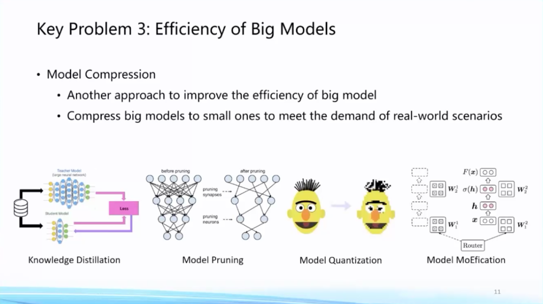 另一个方面,大模型一旦训练好去使用时,模型的「大」会让推理过程变得十分缓慢,因此另外一个前沿方向就是如何高效将模型进行尽可能的压缩,在加速推理的同时保持它的效果。这方面的主要技术路线包括剪枝、蒸馏、量化等等。同时最近我们发现,大模型里面具有非常强的稀疏发放的现象,这对于模型的高效压缩和计算有着非常大的帮助,这方面需要一些专门算法的支持。