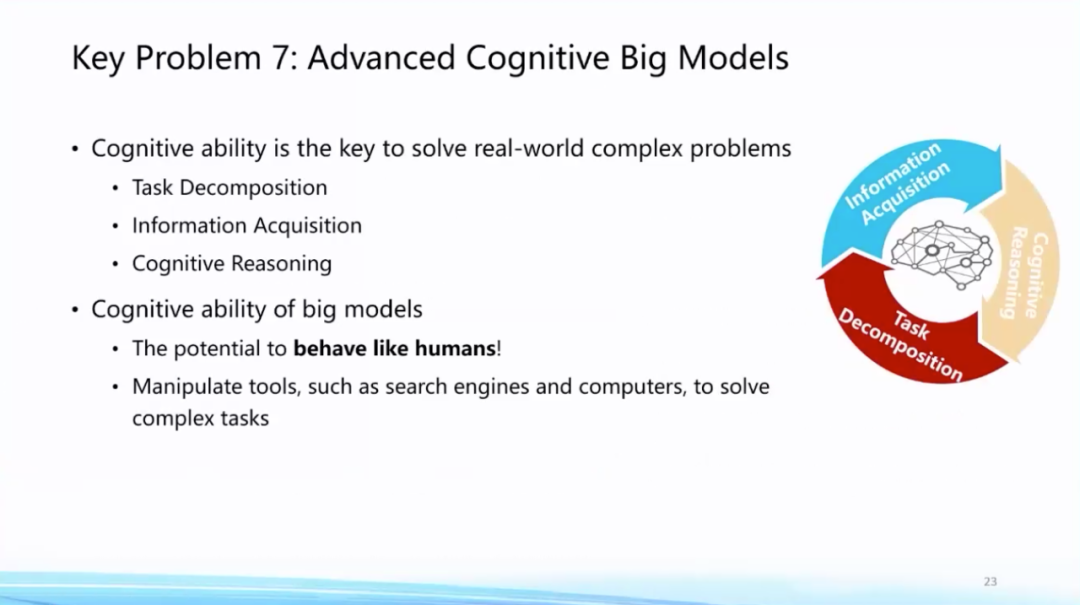 第七个问题,人的高级认知能力是否可以让大模型学到?能不能让大模型像人一样完成一些任务?人去完成任务一般会进行几个方面的工作:一,我们会把这项任务尝试拆分成若干个简单任务,第二,针对这些任务去做一些相关信息的获取,最后我们会进行所谓的高级推理,从而完成更加复杂的任务。