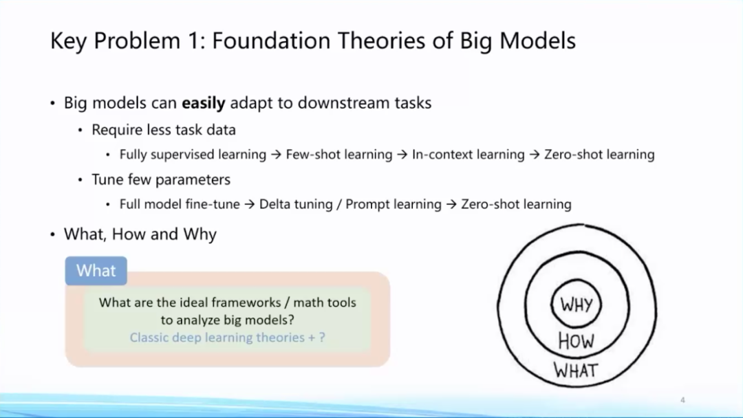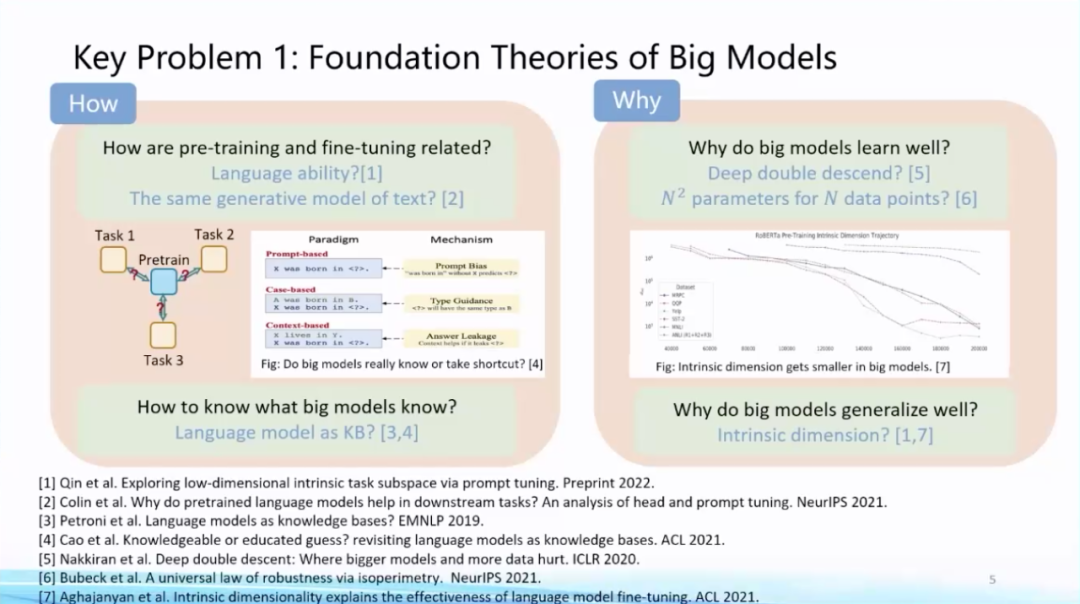 首先,我认为在大模型当中第一个非常重要的问题就是它的基础理论问题。大模型的一个非常重要的特点就是可以利用非常少的下游任务数据进行相关下游任务的适配,无论是全量下游任务的训练数据还是few-shot learning,甚至zero-shot learning,都能达到相当不错的效果。同时在预训练到下游任务适配过程当中,需要要调整的参数量可以非常少,这两个特点都是大模型给我们带来的新现象。
