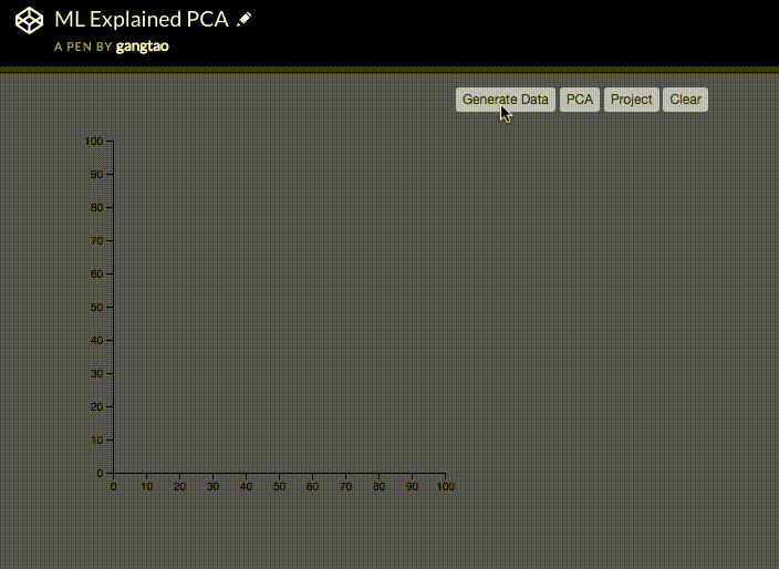 这里我们先用鼠标随机生成8个数据点,然后绘制出表示主成分的白色直线。这根线就是二维数据降维后的主成分,蓝色的直线是数据点在新的主成分维度上的投影线,也就是垂线。主成分分析的数学意义可以看成是找到这根白色直线,使得投影的蓝色线段的长度的和为最小值。