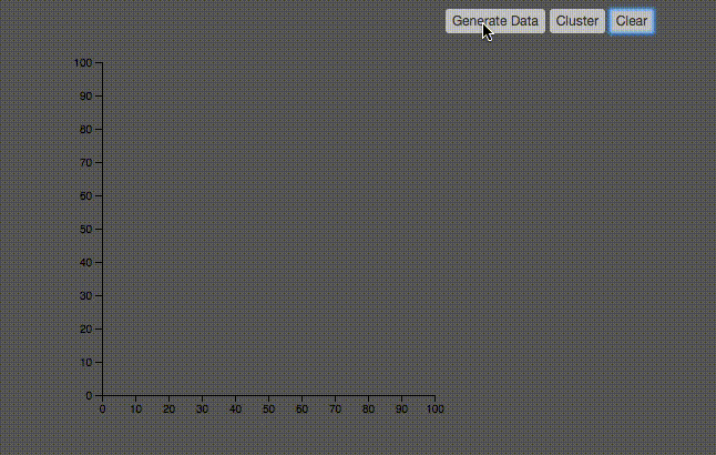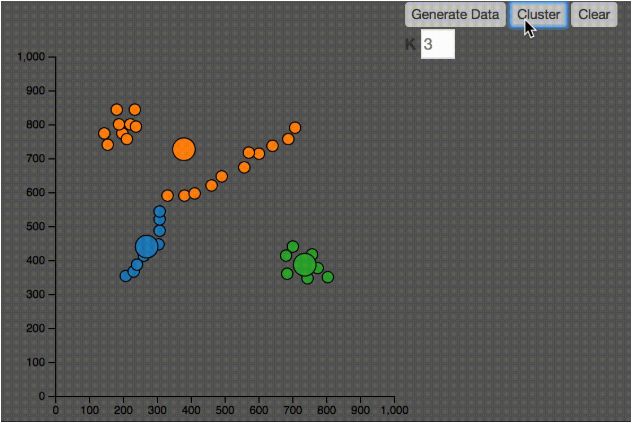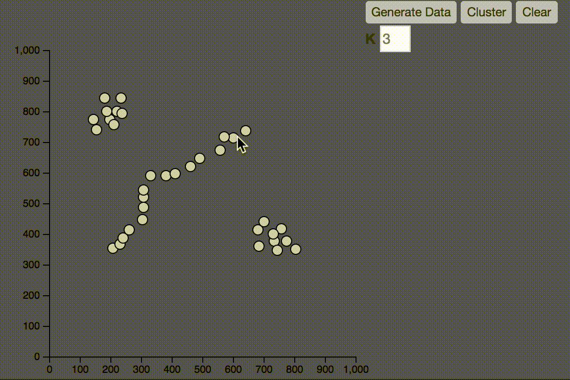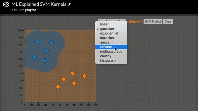 2、由于中心点的初始位置是随机的,有可能并不能正确分类,大家可以在我的Codepen中尝试不同的数据;