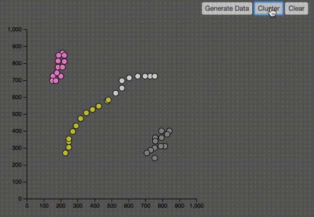 4、重复第二步,直到所有的点都被聚集到聚类中。