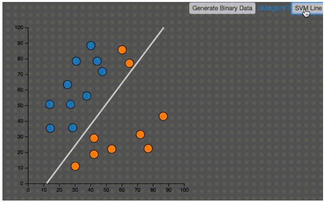 如上图所示,SVM算法就是在空间中找到一条直线,能够最好的分割两组数据。使得这两组数据到直线的距离的绝对值的和尽可能的大。