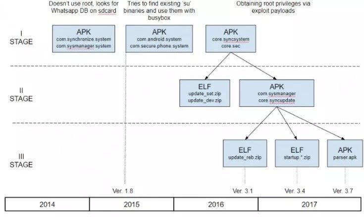 Lookout 的研究人员认为,Chrysaor “间谍软件”可以通过基于 SMS 的钓鱼信息来进行传播,就像 Pegasus 感染 iOS 设备一样。且 Chrysaor 利用了名叫 Framaroot 的著名 Android 漏洞来 root 目标设备并获取设备的完整控制权,以便其从热门的 App 中窃取数据。更重要的是,从 Chrysaor“间谍软件”最初使用至今,NSO Group 很可能还发现了很多新的Android 0 day漏洞,并将相应的漏洞利用代码更新到了新版本的 Chrysaor“间谍软件”之中。