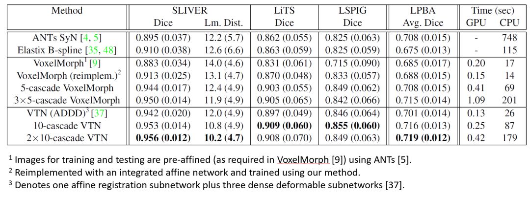 我们基于两种基础网络 VTN 和 VoxelMorph 构建了递归级联网络(递归级联网络可以构建于任何基础网络之上,并不局限于 VTN 和 VoxelMorph)。表1总结了我们与传统算法以及与基础网络相比的总体性能。可以看到,递归级联网络在所有数据集中的 Dice 和关键点距离均显著优于现有方法。