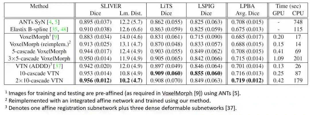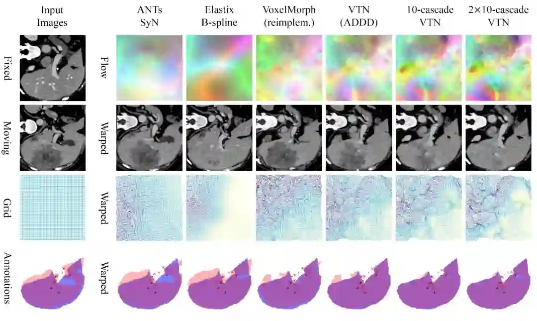 我们在肝脏 CT 图像和脑 MRI 图像上都做了算法评测,使用了多样的评价指标(包括 Dice 和关键点)。我们的实验证明递归级联的结构对于两种基础网络(VTN 和 VoxelMorph)的作用都非常显著,并且在所有数据集上都超过了包括 SyN 和 B-Spline 在内的传统算法。