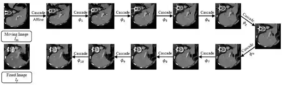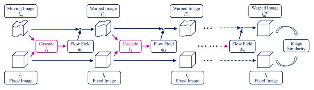 近年来,深度学习技术在医学图像配准中已经获得了广泛的应用。有监督学习方法的主要问题是流场真值(ground truth)很难获得,即便对于医学专家来说,医学图像配准的成对相关像素点也难以标注;而无监督学习方法能够利用可导的 STN(spatial transformer),以在变形图像和固定图像之间测得的图像相似性为优化目标,能够利用临床中广泛的原始数据且无需标注。然而现有算法只能学习将运动图像一次性对齐到固定图像,对于变形大、变化复杂的配准效果较差。