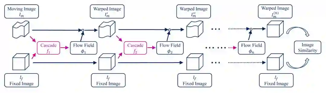 我们的核心思想是通过深度递归级联结构实现渐进式对齐的无监督端到端学习。在图2所示情况下,运动图像与固定图像有很大的不同,这表明流场真值应该非常复杂并且可能很难预测。但是,我们的递归级联网络可以将这一困难的学习过程分解为渐进的部分,使每对之间的流场变得简单易学。
