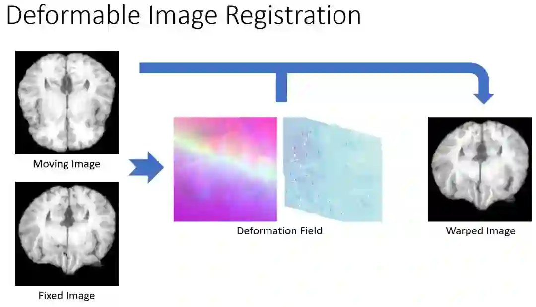 医学图像配准是医学图像处理任务中的关键步骤,具有重要的临床意义。医学图像配准即分别给定一张运动的和固定的 3D 医学图像,希望将运动图像(moving image)配准到固定图像(fixed image),如图1所示。图像可能来自相同或不同个体的三维脑 MRI 的二维切片。通过预测非线性变形场,我们可以将运动图像变形为变形图像(warped image)。在理想情况下,变形图像应该与固定图像非常相似,即便它源自运动图像。