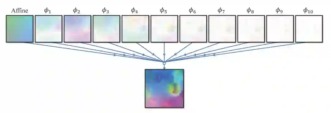另一方面,从模型的流场合成效果图(图3)中可以看出,前面的子网络主要学习到了全局的配准,而后面的子网络起到了完善细节的作用。最终的流场确实可以分解为相当简单的部分。