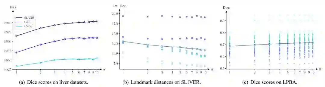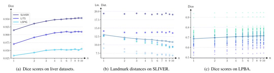 我们使用 Dice 和关键点距离(Landmark Dist.)两种评估指标进行了广泛的实验,并在多个数据集上进行了算法评测,包括肝脏 CT 图像和脑 MRI 图像。