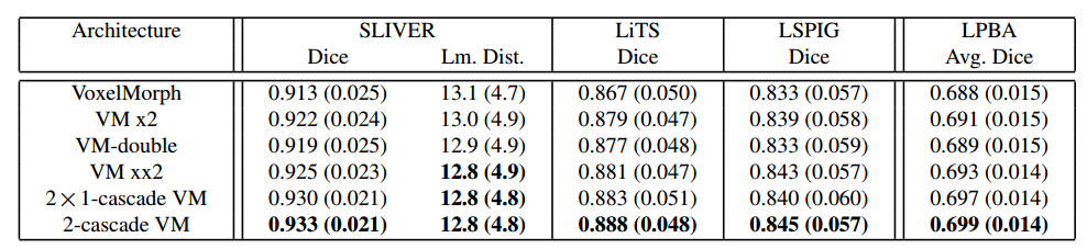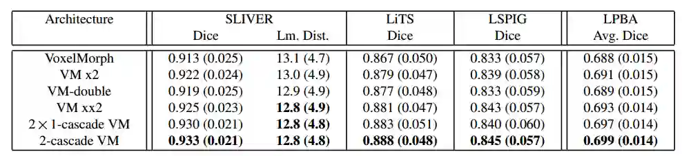 那么,直接增加通道数或者卷积深度能否起到和网络级联一样的效果呢?例如,VoxelMorph(VM)提出将卷积层中的通道数加倍(VM x2)可以获得更好的性能。作为对比,我们通过将卷积层的深度加倍来构造 VM-double,还构造了一种同样将深度加倍的编码器-解码器-编码器-解码器的网络结构(VM xx2),VM xx2 与 2-cascade VM 的结构除了变形操作之外都是相似的。这些 VM 变种相比于 2-cascade VM 都具有相同或更多的参数数量。从表2中可以看出,VM 变种的表现都不如 2-cascade VM,甚至还不如直接 shared-weight 的 2x1-cascade VM。该实验表明,我们的改进本质上是基于所提出的递归级联结构,而不是简单地引入更多参数。
