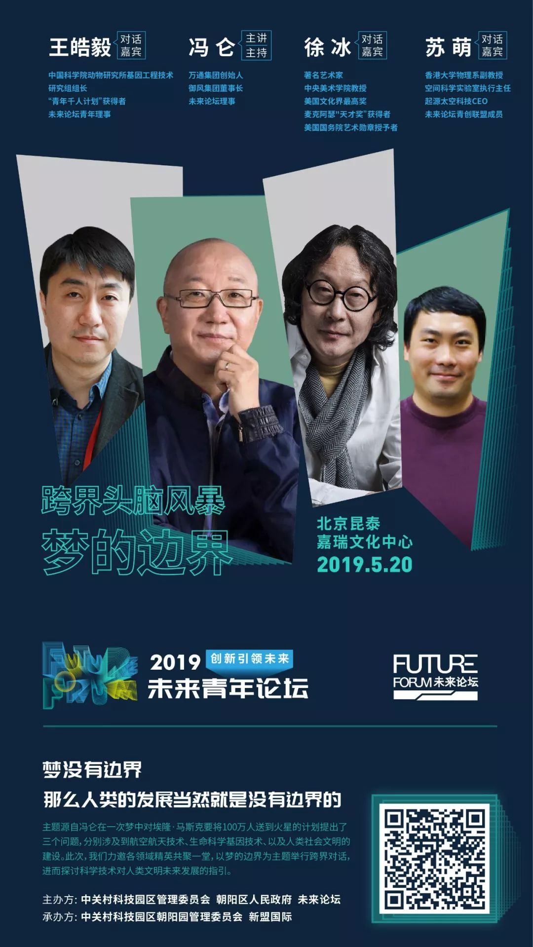 万通集团创始人、御风集团董事长、未来论坛理事 冯仑 更带着他的“梦的边界“来到现场与著名艺术家、中央美院教授、美国文化界最高奖麦克阿瑟“天才奖“获得者、美国国务院艺术勋章授予者 徐冰,中国科学院动物研究所基因工程技术研究组组长、“青年千人计划“获得者、未来论坛青年理事 王皓毅,香港大学物理系副教授、空间科学实验室执行主任、起源太空科技CEO、未来论坛青创联盟成员 苏萌,展开跨界头脑风暴,更有多项青年创新达人秀参与交流和碰撞。