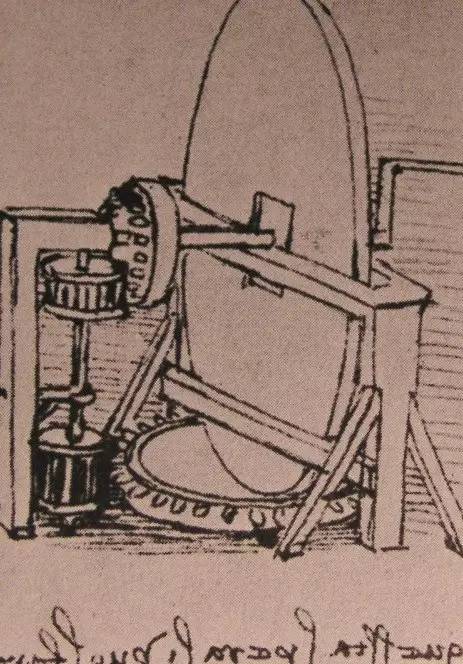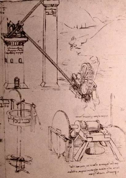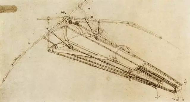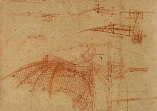 在达·芬奇的笔记中能看到不少飞行装置,其中最著名的是飞机螺旋桨草图,经常被称为直升机设计的鼻祖。理论上,这个由亚麻布、绳索和支架构成的螺旋装置可以通过旋转升空,比莱特兄弟早了将近500年!当时,佛罗伦萨人的演出中经常有人物或道具从天而降,或者如魔术般的悬在半空。类似的笔记页中还有一些跟演出相关的内容,因此,这些飞行装置当时有可能是为了娱乐观众而设计的。