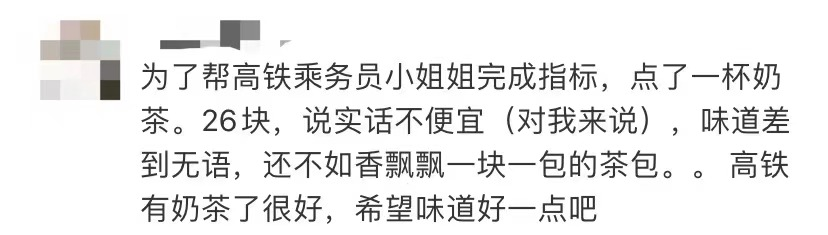 除了矛头直指的包装设计,还有网友吐槽高铁奶茶的味道不好,认为其性价比不高。