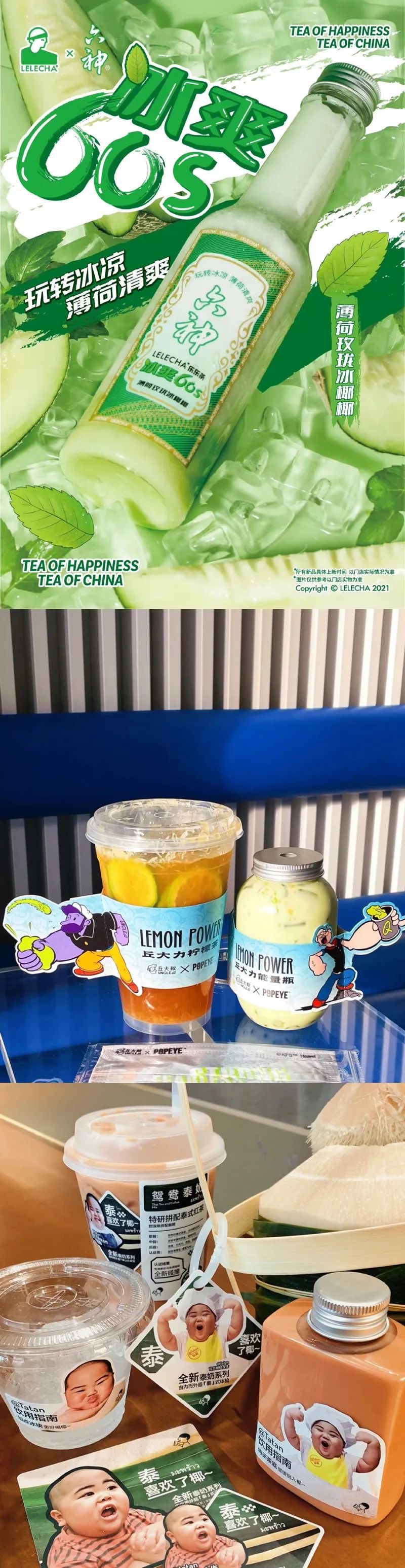 近日,乐乐茶就联名老字号六神推出了一款奶茶,饮品外观包装上高度还原六神花露水的经典瓶型;丘大叔与童年经典的大力水手这一IP推出丘大力能量瓶;喜茶与网红Tatan联名推出具有泰国风格的饮品,并赠送Tatan的表情包贴纸周边……