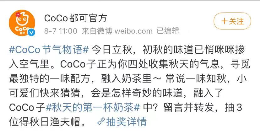 在今年立秋之际翻红的“秋天的第一杯奶茶”,很多茶饮品牌也因此借势,通过季节的变换去打造限定的营销场景来维护消费者需求的仪式感。在满足消费者需求的同时,也找到了最适宜的营销契机,可以说是一举两得。