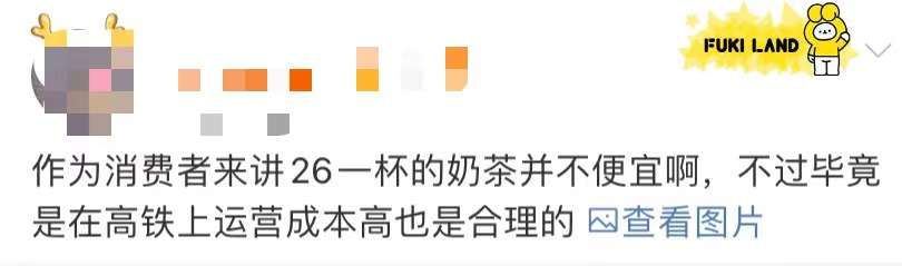 有网友表示在高铁上的运营成本高,奶茶定价高也是合理的,可以接受。