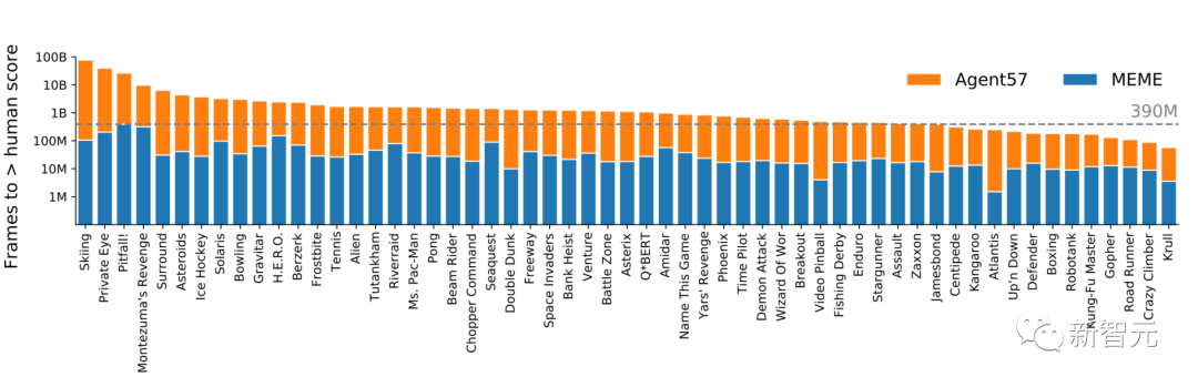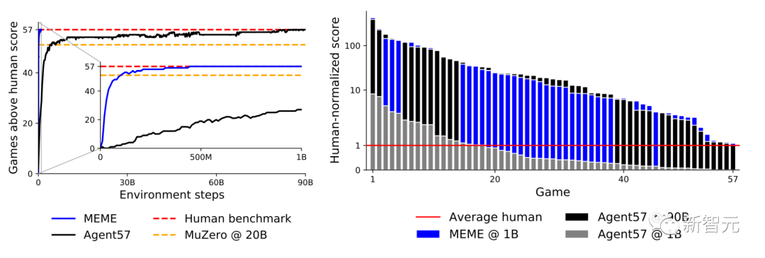 下面的蓝色柱子是MEME的表现,红线是人类玩家表现,纵轴仍然是对数。