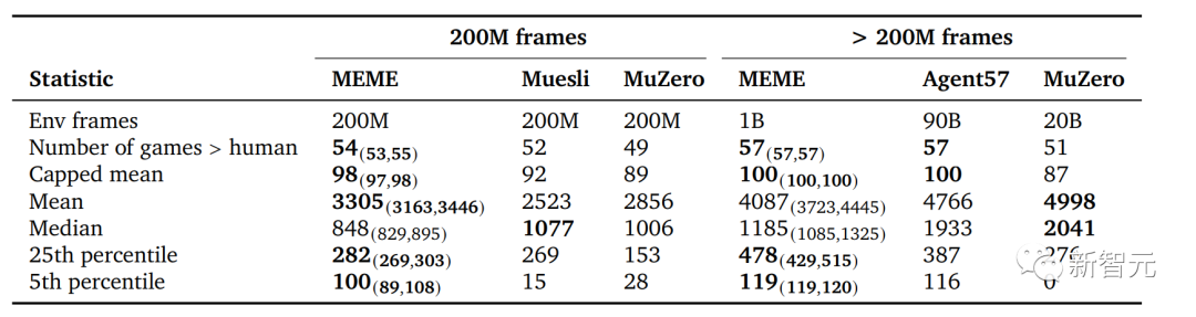 上面是在2亿帧环境训练下,以及10亿、200亿、900亿帧环境训练下,不同智能体在257个Atari游戏中表现。