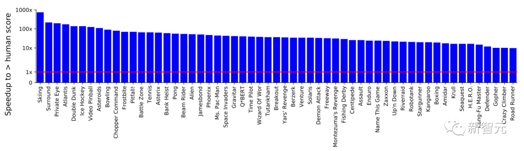 可以看到,最高的一个游戏已经接近人类表现的1000倍,但平均表现比人类强出100倍是妥妥的了。