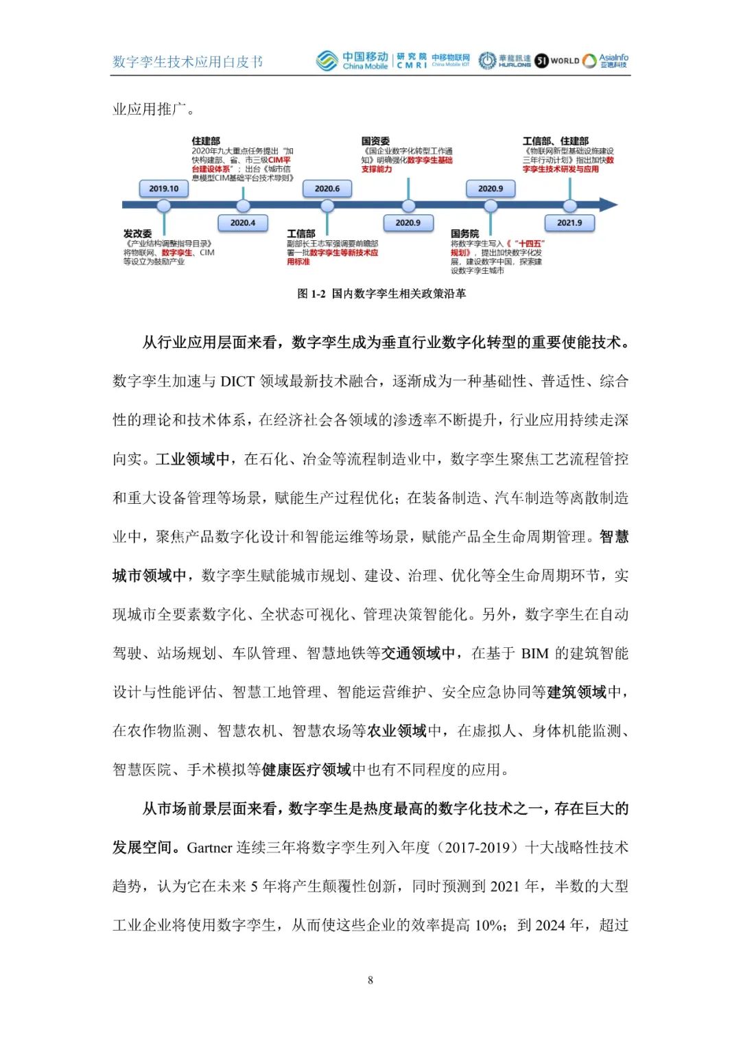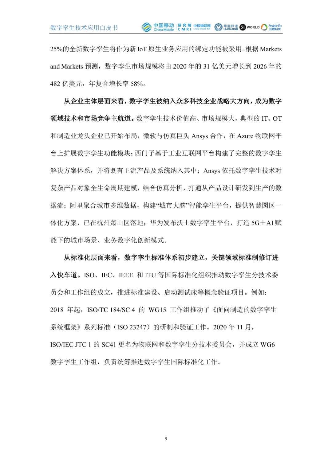 白皮书指出,从政策层面来看,数字孪生成为各国推进经济社会数字化进程的重要抓手;从行业应用层面来看,数字孪生成为垂直行业数字化转型的重要使能技术;从企业主体层面来看,数字孪生被纳入众多科技企业战略大方向,成为数字领域技术和市场竞争主航道;从标准化层面来看,数字孪生标准体系初步建立,关键领域标准制修订进入快车道。