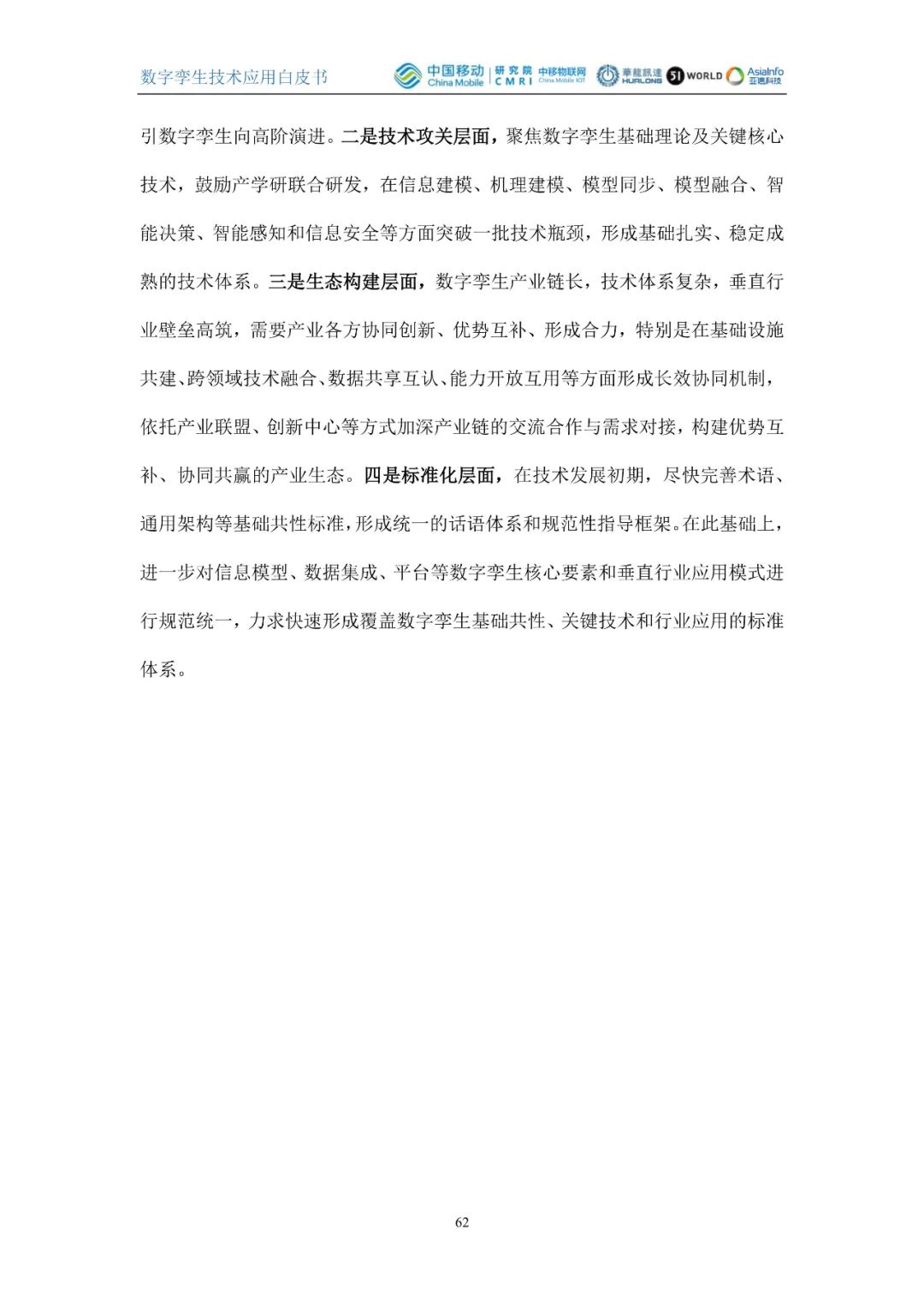 四是标准化层面,在技术发展初期,尽快完善术语、通用架构等基础共性标准,形成统一的话语体系和规范性指导框架。在此基础上,进一步对信息模型、数据集成、平台等数字孪生核心要素和垂直行业应用模式进行规范统一,力求快速形成覆盖数字孪生基础共性、关键技术和行业应用的标准体系。