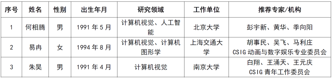 中国图象图形学学会推荐第八届中国科协青年人才托举工程项目拟推荐人选名单