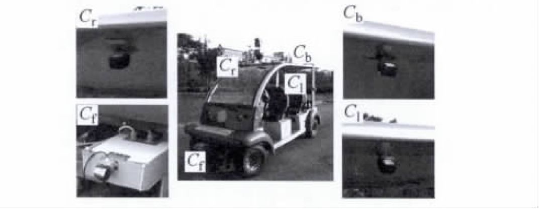 实验平台如图 10 所示。包括安装在车身 4 周的 4 个鱼眼摄像头、测方向盘转向的旋转编码器、测车速的速度编码器、车的控制系统和里程计编码器。