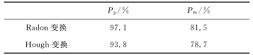 在相同的检测方法下,Radon 变换与 Hough 变换的对比效果如图 11 所示。由图可见,在同等条件下,Radon 变换表现出了较高的鲁棒性和精确性,这些正是 Radon 变换的线积分特性。另外,Radon 变换在同时检测多个停车位上具有良好的优越性(见图 12)。实验统计了 2626 帧图像,对比 Radon 与 Hough 变换在相同条件下检测的精度,结果如表 1 所示。表中,P_p 为精确率,P_re 为回召率。