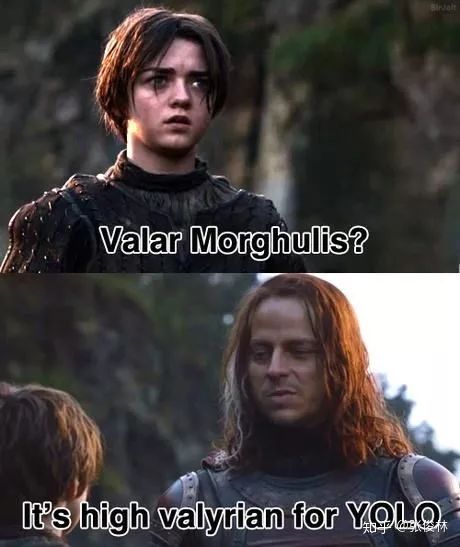 美剧《权力的游戏》中,宗教刺客团体“无面者”成员之一的贾昆,在他和艾莉亚·史塔克分别之际,将一枚特殊的小硬币交给了艾莉亚,并教会艾莉亚一句话,原话是这样的: