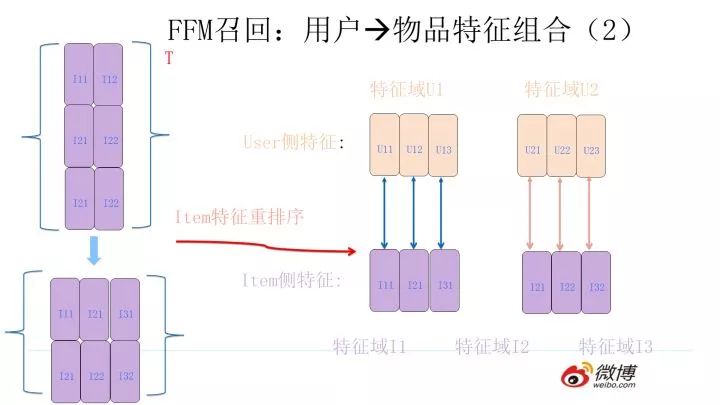 上面那张图的特征向量之间的对应关系,看着确实有点让人眼花缭乱,那么能否让它们的对应关系看上去更简洁直接一些呢?很简单,只需要把物品侧的特征向量重新排下顺序即可。这个重排序的过程,可以看做是:对原先顺序排列的物品侧特征向量矩阵,做了一个转置操作。这样,每个物品侧的特征向量,就和需要求内积的对应用户侧特征向量,形成了整齐的一一对齐的效果了。具体过程参考上图。
