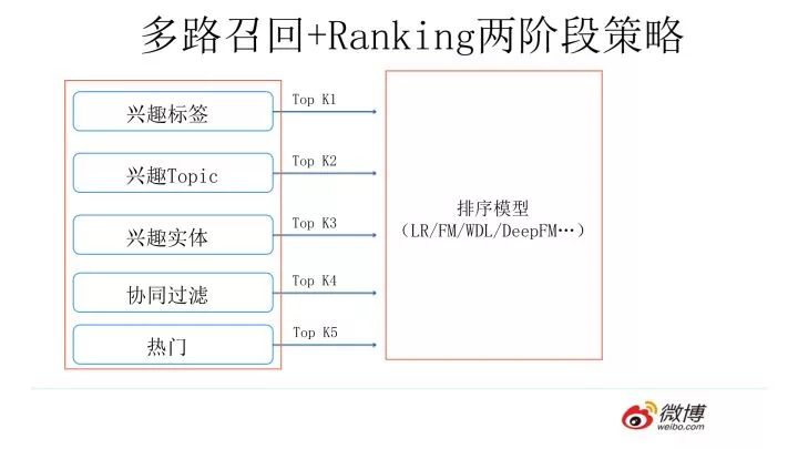 目前工业界的推荐系统,在召回阶段,一般都采取多路召回策略。上图展示了一个简化版本的例子,以微博信息流排序为例,不同业务召回路数不太一样,但是常用的召回策略,基本都会包含,比如兴趣标签,兴趣Topic,兴趣实体,协同过滤,热门,相同地域等,多者几十路召回,少者也有7/8路召回。