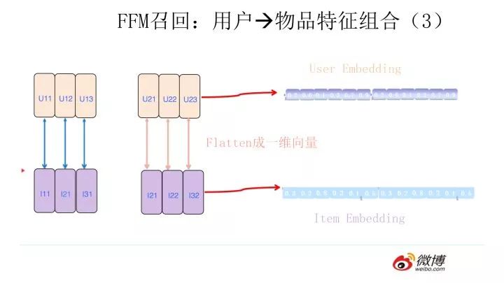 我们讲过,模型做召回,要解决的问题是:如何利用FFM原则打出对应的用户侧embedding和物品侧embedding。前面两段所讲的,是根据FFM原则,对应的特征向量应该如何对齐的过程,而如果向量对齐后,怎么打出两个embedding向量?很简单,把刚才对齐的二维向量拉平,顺序concat连接,就形成了展开的一维的用户embedding和物品embedding。
