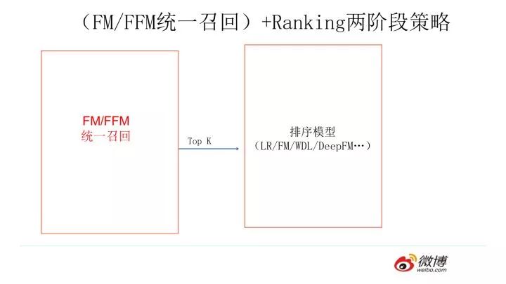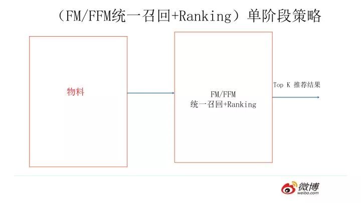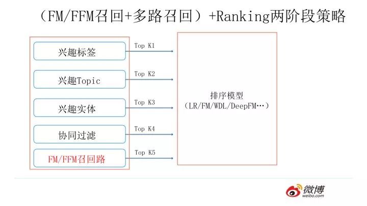 对于比如兴趣分类,兴趣标签,热门,地域等召回策略,要把这些召回渠道统一到FM/FFM模型相对直观,只需要在训练FM/FFM模型的时候,针对每一路的特性,在用户特征端和物品特征端新增对应特征即可。比如对于地域策略,我们可以把物品所属地域(比如微博所提到的地域)和用户的感兴趣地域都作为特征加入FM/FFM模型即可。兴趣标签,Topic,兴趣实体等都是类似的。所以大多数情况下,在多路召回模式下你加入新的一路召回,在FM/FFM统一召回策略下,对应地转化成了新增特征的方式。
