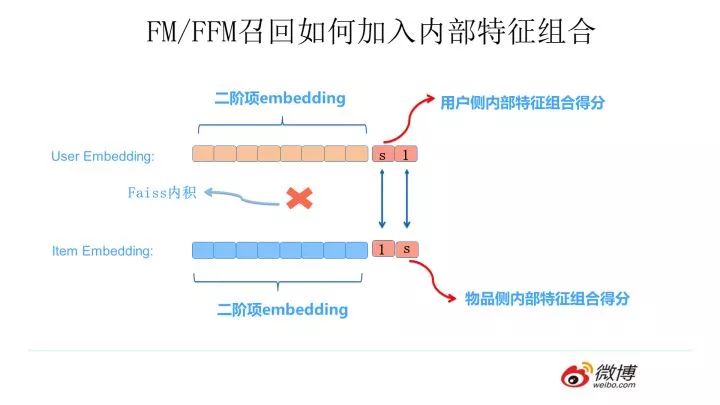 可以如上图所示去做,在用户的二阶项embedding后添加两位:一位就是用户侧内部特征组合得分,在对应的物品侧位置,增加一位,值设置为1。这样的话,在Faiss做内积的过程中,就将用户侧内部特征组合得分计入;类似地,在物品侧也可以如此炮制。这样就将U和I的内部特征组合融入FFM召回模型中了,FM模型也是一样的道理。
