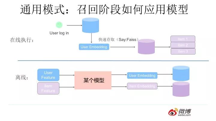这是它们最大的不同,一个不同是召回阶段要计算的数据量巨大;另外一个不同是貌似我们手头只有用户特征,此时如何应用模型呢?所以你可以看出来,在召回阶段,使用某个具体的模型,比排序阶段使用这个模型的应用条件更苛刻,需要满足一定的模式,才能把某个模型用到召回阶段。那么,怎么做呢?