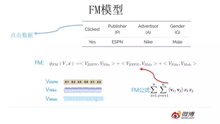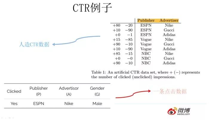 上图是一个人造的广告CTR的数据例子,代表的意思是在某个网站(Publisher)上刊登一则广告(Advertiser),某个用户(用户性别特征Gender)是否会点击某条广告的数据。这个例子中假设包含三个特征域(Field):网站Publisher(可能的特征值是ESPN、Vogue、NBC)、广告(可能的特征值是Nike、Adidas、Gucci)和性别特征Gender(可能的特征值是Male、Female)。由这个例子可以看出组合特征的重要性:如果在体育网站ESPN上发布Nike的广告,那么100次展现,80次会被点击,而20次不会被点击。意味着组合特征(Publisher=”ESPN” and Advertiser=”Nike”)是个很强的预测用户是否点击的二阶组合特征。上图同时展示了一条用户点击记录。
