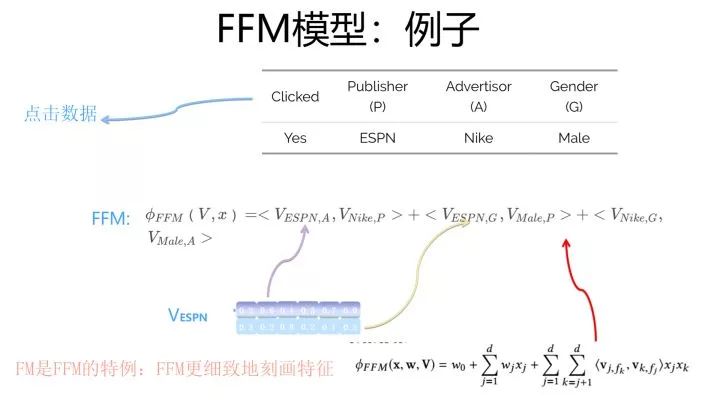 我们再回头看下刚才那个点击数据的例子,看看在FFM场景下是怎样应用的,上图展示了这个过程。因为这个例子有三个特征域,所以Vespn有两个特征embedding,当和Nike特征组合的时候,用的是针对Advertisor这个特征域的embedding去做内积;而当和Male这个特征组合的时候,则用的是针对Gendor这个特征域的embedding去做内积。同理,Nike和Male这两个特征也是根据和它组合特征所属特征域的不同,采用不同的特征向量去做内积。而两两特征组合这个事情的做法,FFM和FM则是完全相同的,区别就是每个特征对应的特征embedding个数不同。FM每个特征只有一个共享的embedding向量,而对于FFM的一个特征,则有(F-1)个特征embedding向量,用于和不同的特征域特征组合时使用。