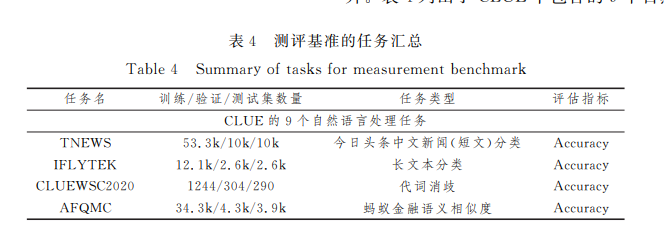 首先,从使用人数上看,中国人口占世界人口的五分之 一,人数庞大,因此中文是世界上使用人数最多的语言;其次, 从语言体系上看,中文与英文差异较大;最后,从数据集角度 出发,中文领域公开可用的数据集较少,此前提出的中文预训 练模型在英文评测基准上评估,无法完全体现出模型性能. 当下预训练模型的发展极其迅速,英文领域的评测基准已步 入成熟阶段,而中文领域的缺失必然会导致技术落后,因此中 文领域的评测基准必不可少.本节主要介绍4种不同的评测 基准.