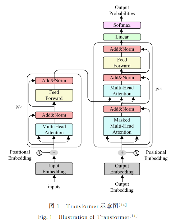 自2021年以来,中文预训练模型进入井喷式的发展阶 段,其架构主要基于 Transformer和 BERT 两种基础模型,本 节主要介绍这两种模型. 图1为典型的 Transformer架构,该架构由6个结构相 同的编码器和解码器堆叠而成.单个编码器由堆叠的自注意 力层和前馈神经网络组成,解码器由堆叠的自注意力层、掩码 注意力层 和 前 馈 神 经 网 络 组 成.有 关 Transformer的 详 细 细节介绍请参考文献[14].
