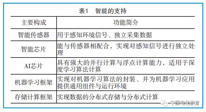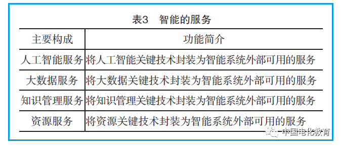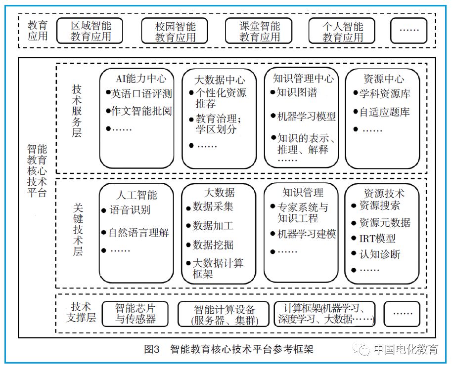 具体到教育场景中,智能技术需提供以下四类关键技术服务:实现对从环境中感知到的信号、符号、素材等原始数据的处理,需要人工智能关键技术;对大量原始数据进行清洗、加工,并整理成为结构化数据即有用的信息,需要大数据关键技术;从信息中提炼、加工、体系化并形成知识,需要知识管理关键技术;原始数据、信息、知识、智能的存在与使用都离不开物理和信息载体等资源支持,需要资源关键技术。
