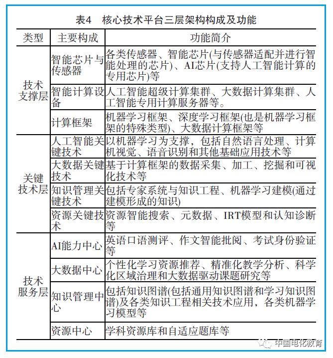 智能教育核心技术平台参考框架分为三层架构:(1)技术支撑层,为平台提供软硬件支撑环境;(2)关键技术层,包含各类关键智能技术;(3)技术服务层,建立四大服务中心,将关键技术与教育业务场景相结合形成技术服务,并开放给平台外部用户。三层架构的具体构成及功能如表4所示。