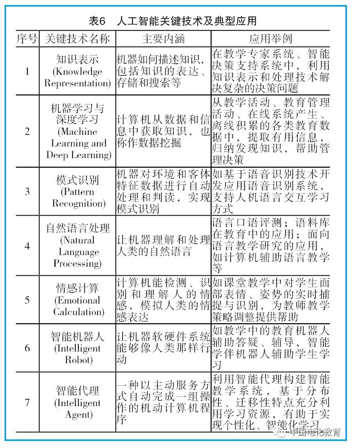 从国内的探索与实践看,在教育领域中广泛应用的人工智能关键技术主要有知识表示方法、机器学习与深度学习、自然语言处理、智能代理、情感计算,可用于智能导师、教育机器人、学习伙伴、智能测评、教育数据挖掘、学习者数字画像等教育应用[19]。本研究综合以上维度对已有专用人工智能发展及其在教育领域应用的分析,如表6所示,在纵向上是智能教育中具有潜力的人工智能关键技术,主要包括知识表示、机器学习与深度学习、模式识别、自然语言处理、情感计算、智能机器人、智能代理等类型,在横向上对其研究主要方法进行梳理,重点对其教育中的应用场景进行概括说明。
