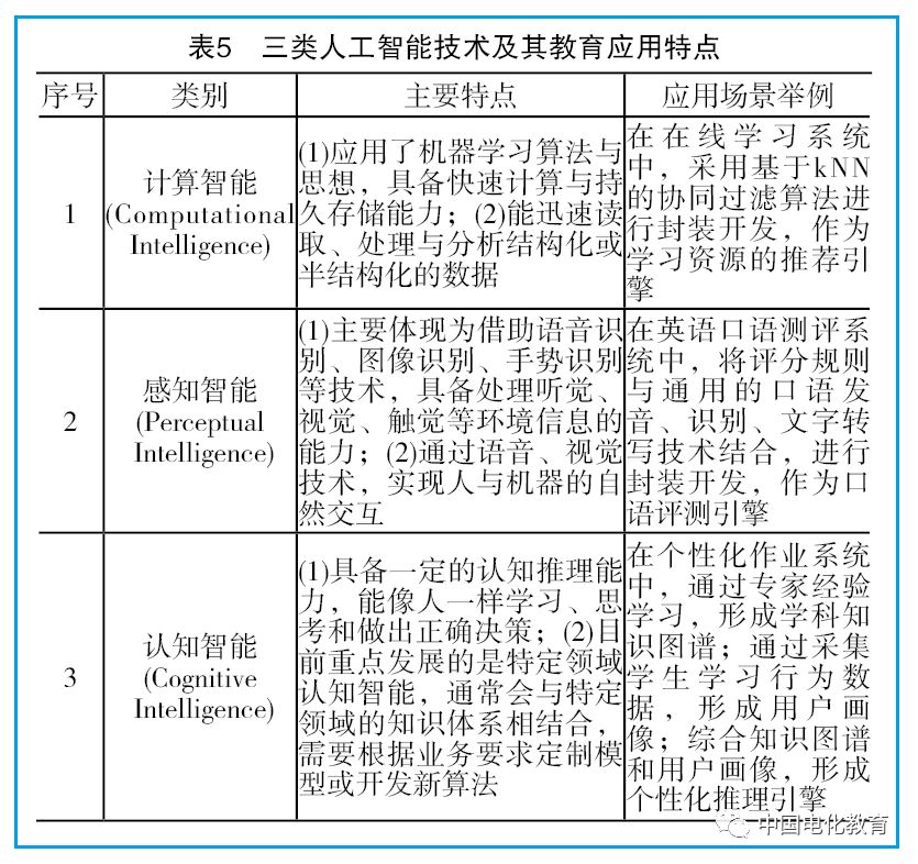 计算智能、感知智能和认知智能是人工智能发展的三个重要阶段,同时代表着人工智能在教育领域应用的三个不同层次。计算智能基于结构化和非结构化数据处理与分析,主要用于解决复杂的计算问题;感知智能具备处理听觉、视觉、触觉等感知和获取环境信息的能力,实现人与机器的自然交互;认知智能目前具备一定程度的认知推理能力,能像人一样学习、思考和做出正确决策[16]。由于三类人工智能技术发展阶段和技术要求不同,它们在产品研发和实践应用中显现出不同的特点。从产品研发的企业技术门槛要求来看,呈现为从技术门槛相对较低到门槛较高、再到显著的高技术门槛,正因为此,目前市场主流的智能教育产品仍然是基于计算智能和感知智能技术的教育教学产品,体现认知智能的产品数量少、且往往限定在特定场景或特定领域之中[17]。从产品中体现的智能技术应用层次来看,基于计算智能的应用与教育场景只做了浅层的结合,基于感知智能的应用与教育场景做到了中等层次的结合,基于认知智能的应用与教育场景做到了深层次的结合,这也是智能教育进一步发展的方向。在教育领域三类人工智能技术主要应用特点如表5所示。