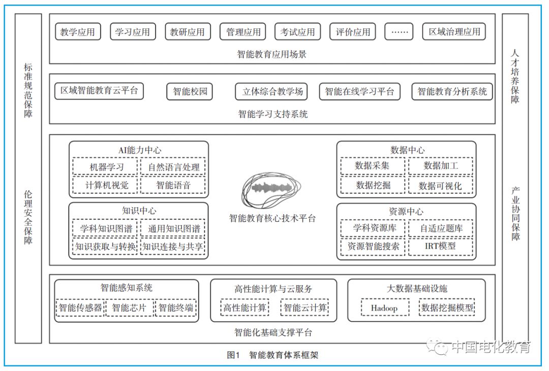 4.智能教育应用场景。智能技术在教育场景的应用是发挥智能技术价值,构建新型教育模式的必然路径。基于智能关键技术及智能学习支持系统,实现教育教学全场景的智能化应用,包括智能备课、智能授课、智能作业、智能教研等教学辅助型应用,学习路径规划、学习资源推荐、自适应学习等学习增强型应用,智能组卷、智能监考、智能评阅、智能考试分析等考试评价型应用,智能排课、智能班牌、智能安防、智能设备管理、家校互通、区域大数据治理等管理服务型应用,体质健康管理、心理诊断与康复、家教陪伴、特殊教育等身心保障型应用。