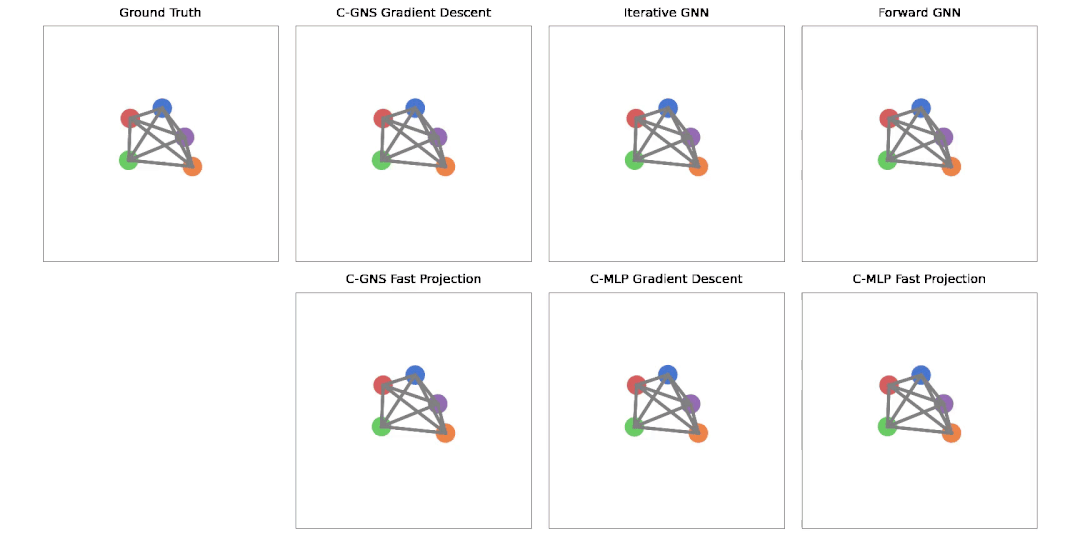 表示整个系统的趋势,比较抽象,在不同场景里可以扮演不同角色,比如速度,加速度,可以看做节点的额外特征。因此,一个时间节点下的模拟器应当是利用当前节点信息预测当前系统的趋势。(b)细化了这个模拟器本身的具体流程,传入t之前时刻的节点信息和初始的系统状态,加入一个GNN约束的方程,即可更新整个系统的信息,之后再用系统的信息更新节点信息。(c)中假设了一个简单场景,如果两个小球碰撞,约束器会如何优化