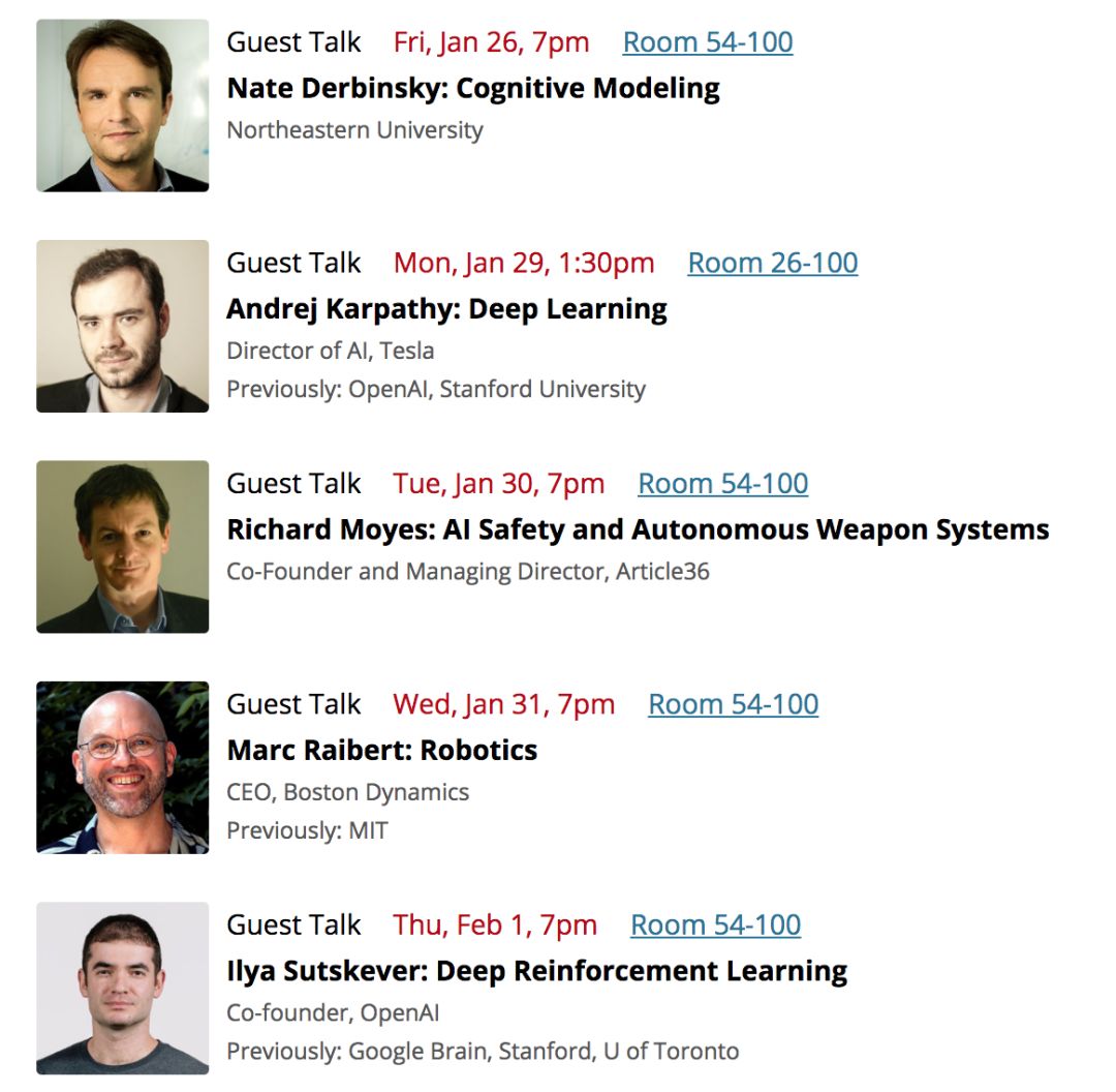 与MIT在上个月同期放出的一门深度学习入门课程相比(6.S191: Introduction to Deep Learning),这门课程更偏工程和业内,同时也请到了非常多的大咖加盟。除了MIT自家的教授和其他高校研究者的日常课程,还有5次课程邀请到了相关从业者,包括特斯拉的AI研究中心负责人Andrej Karpathy、波士顿动力CEO Marc Raibert、OpenAI的联合创始人Ilya Sutskever等都讲带来各自领域的演讲。