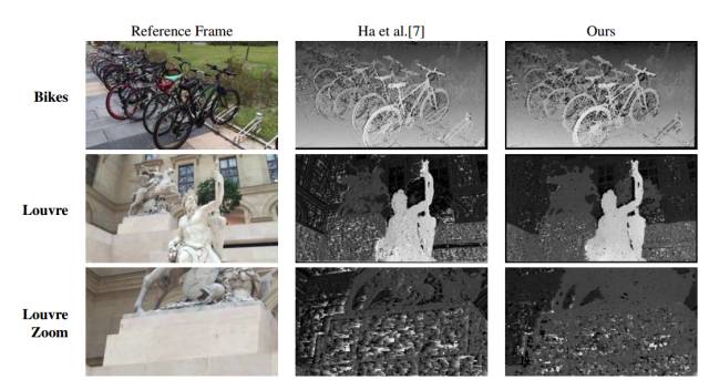 在论文中,作者将自己的算法与目前最新的短基线算法(Ha)进行了全面、定量的比较,包括速度、质量、基线长度和视频大小,使用的数据是人工合成真实感照片。作者的实验结果表明提出的算法能够处理更大范围的基线和数据量更大的视频。作者也使用了Ha中的数据进行了定量实验,发现文中算法在密集深度图质量近似或更好的情况下,速度至少有10倍以上的提升。